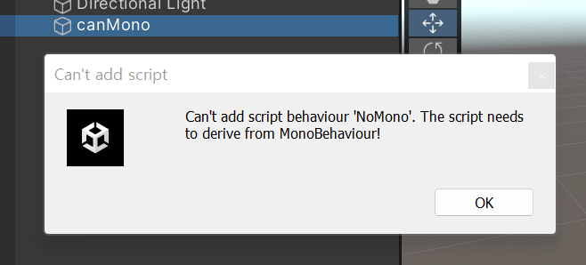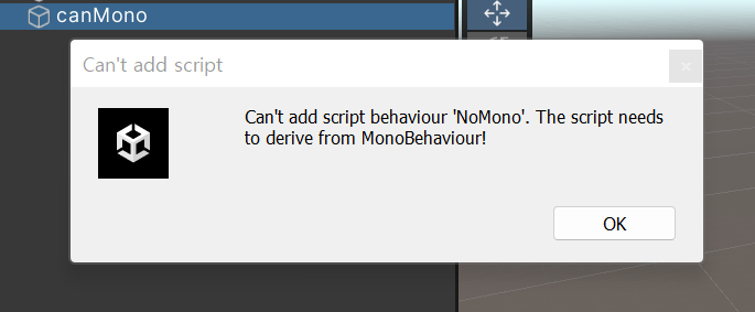 그리고 해당 스크립트를 오브젝트의 컴포넌트로 추가하려 하자... 안됩니다.